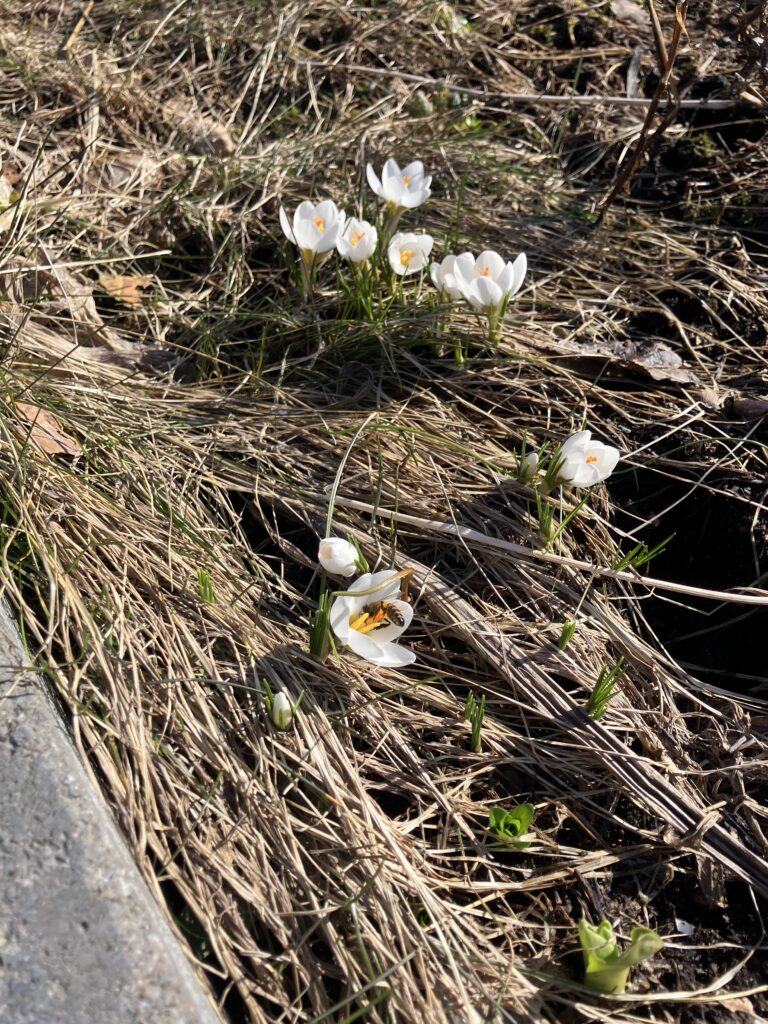 I mormorsträdgården blommar de gula krokusarna och vid pärontrappen är även lila krokusar i gång. I alla krokusstånd är bin aktiva. Man blir så glad när man ser dem surra runt.