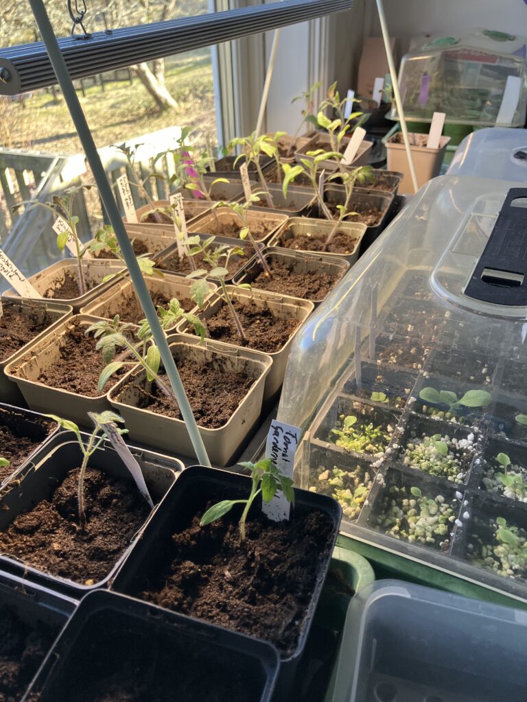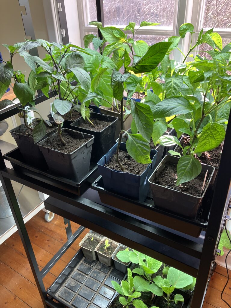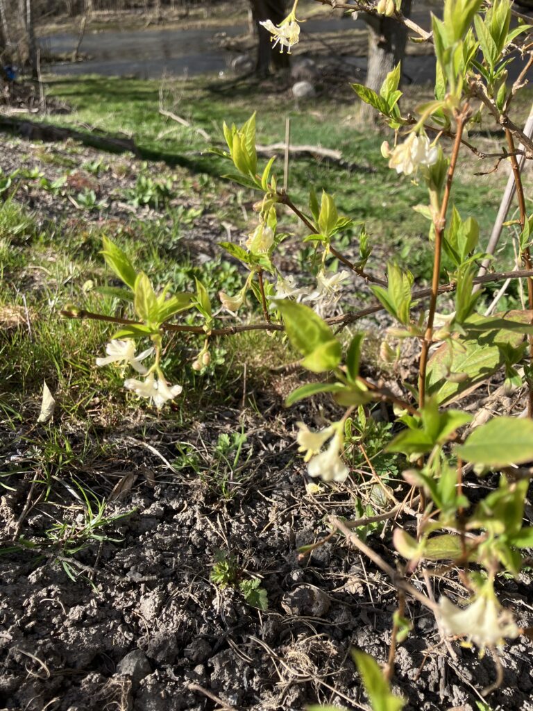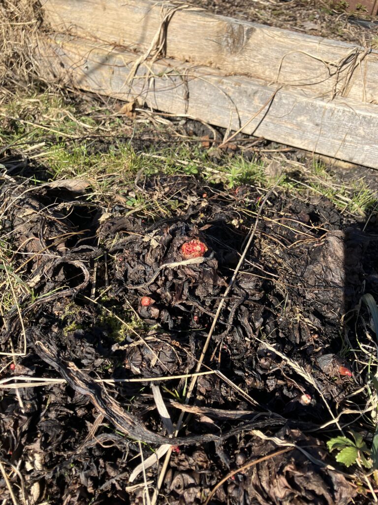Rabarbern visar sina röda kullar och i matlandet tittar vitlöken upp.