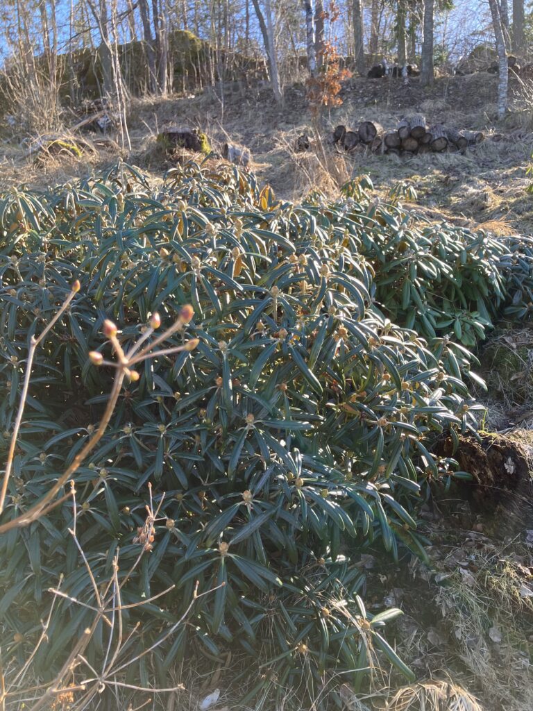 Gräsmattan nedanför rododendronbacken är vattenmättad som vanligt så här års. Det är som att gå i ett träsk där skorna sugs fast. I backen ser det ganska lovande ut. Många buskar har rikligt med knopp. På bilden syns den japanska sidan.