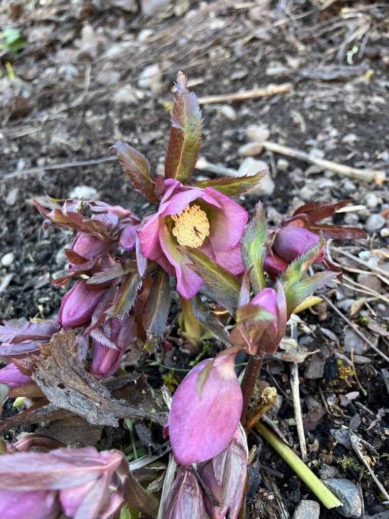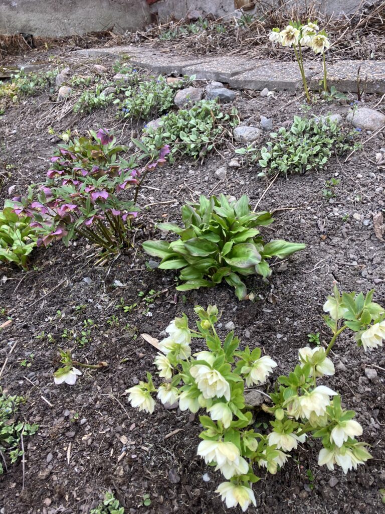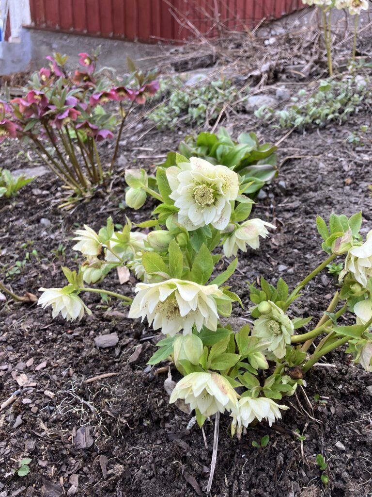 Den första rabatten som får sin vårklippning är den på framsidan av lillstugan. Den har sin bästa tid på våren. Här har den första julrosen slagit ut.